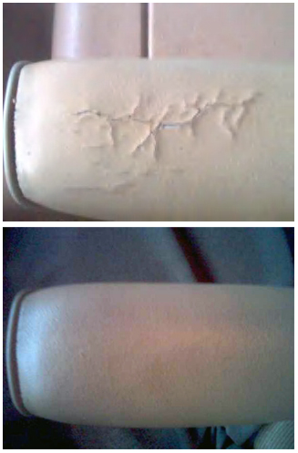 This is a prime example of leather interior starting to crack and wear. As you can clearly see in the after shot of this photograph, it looks as good as new when the repair is completed.