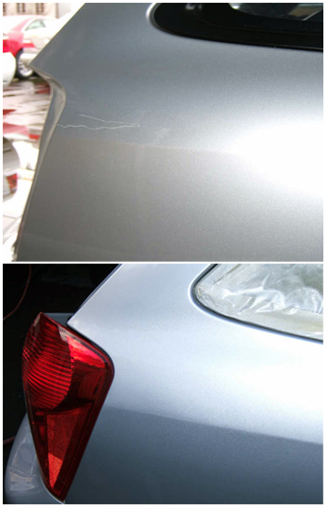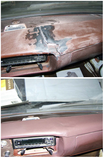 Another interior repair is depicted in this photograph where the vinyl dashboard of the vehicle is completely damaged. The after shot shows a complete restoration of the dashboard and looks brand new.