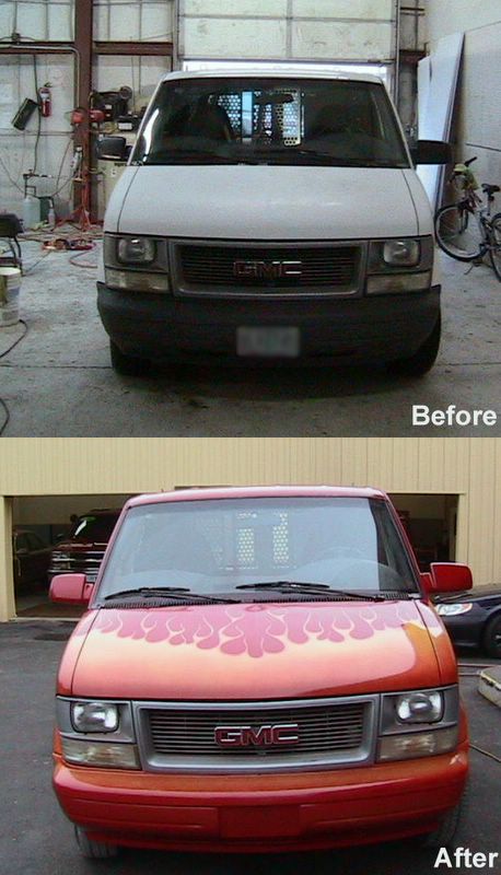 This is an excellent example of a complete custom paint job transforming a dull, plain white van into a flaming red masterpiece.